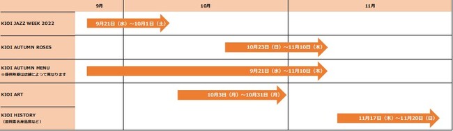 インストアライブや、無料ミニライブで上質なジャズを味わえる『KIOI JAZZ WEEK 2022』や、約90品種・600株のバラ園が秋の見頃を迎える『KIOI AUTUMN ROSES』なども開催