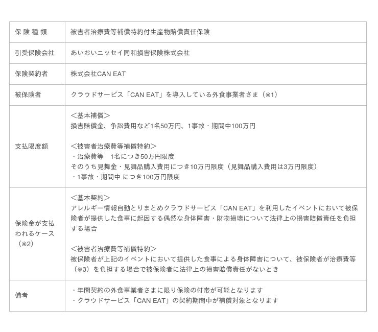 CAN EATが開発・運営するアレルギー情報自動とりまとめクラウドサービス「CAN EAT(キャンイート)」を導入いただいたホテル・ウェディング・飲食店等の外食事業者の皆さまに対し、本サービス利用時において万が一アレルギー事故が発生し事業者側が法律上の損害賠償責任を負担する場合や、法律上の損害賠償責任が発生しないときでも治療費・見舞金等を負担する場合に、アレルギー事故の被害者に支払った治療費・見舞金等を補償する保険を自動的に付帯します。