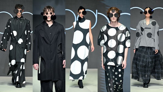 ドット柄を直径からデザインする「φ(ファイ)」シリーズ、視点を変えるとドット柄が出現する「FOCUS」シリーズなど、ブランド定番シリーズの新作が次々と登場。また、すべてのルックでディティールにこだわり、シャツやネクタイまで同じ生地で製作したハーフジャケットのセットアップや、シースルー素材に箔のドットプリントを施したり、大小のホールが開いたドット柄ジャケットから別のドット柄を覗かせるようなルック、そしてdodot.では定番となっている巨大なドット柄をワンピースの全面にプリントしたものなど、dodot.ならではの表現の幅を感じられます。