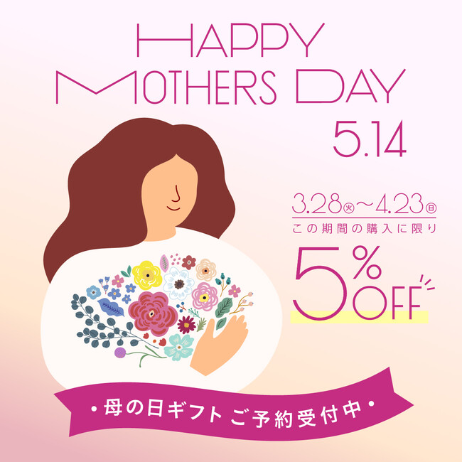 概要:指定された期間で母の日シリーズをご購入いただくと5%オフとなり、さらにお届けの日付指定が可能となります。