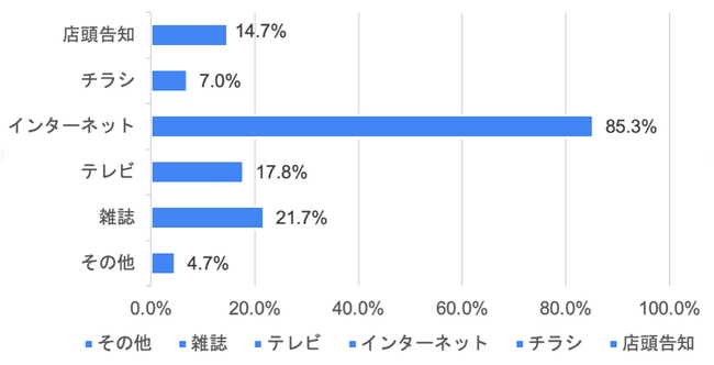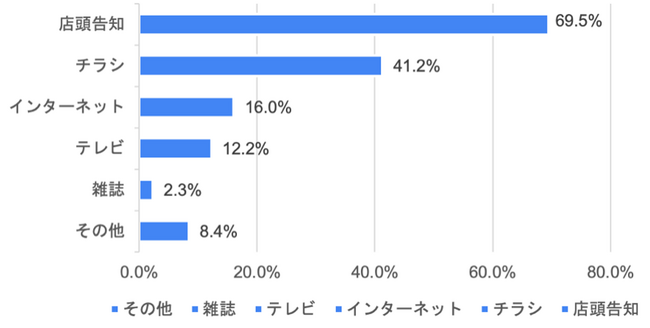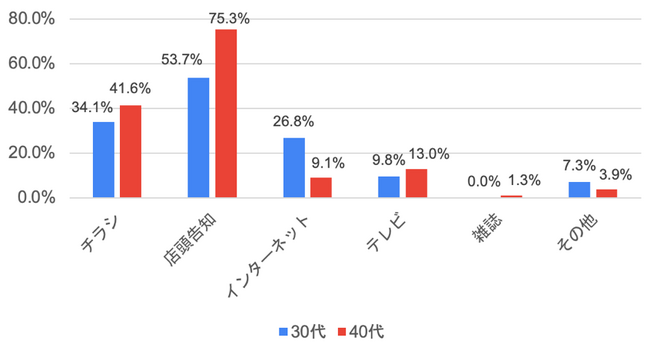 全体結果に対し、30代と40代での差異を分析すると、鶏肉を購入する時、30代は比較的、インターネットを見る傾向、40代は比較的、店頭告知を見る傾向が見られた。