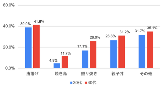 全体結果に対し、30代と40代での差異を分析すると、鶏もも肉でよく作る料理は、30代、40代とも唐揚げが最も多く差異はなく、40代では照り焼きや焼き鳥が比較的多いことが示唆された。