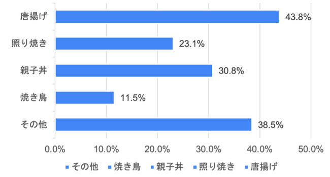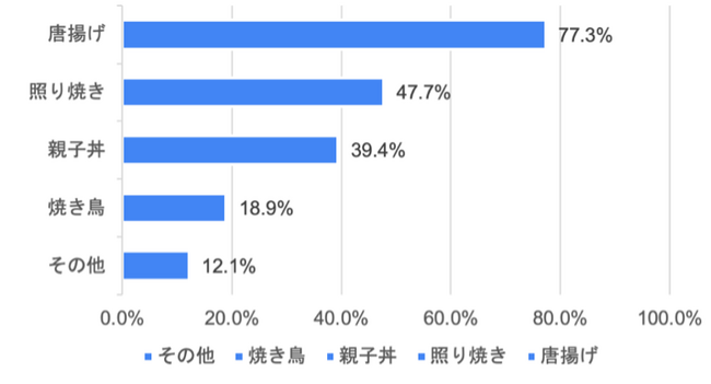 設問3と設問4における回答の傾向から、「親子丼」が鶏もも肉では3番目に、鶏むね肉では2番目に多い結果となった。