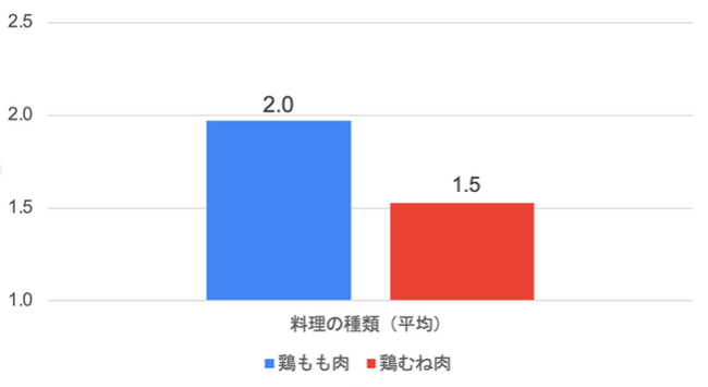 設問3と設問4における回答数から、鶏もも肉の方が鶏むね肉より多くの種類の料理がつくられていることが示唆された。