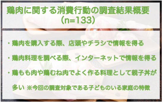 一般的に、鶏もも肉や鶏むね肉を代表する料理として、唐揚げや照り焼きが知られていることに対して、「親子丼」が比較的多かったことは今回の調査対象である子どものいる家庭特有の傾向であると言え、料理を決める際に子どもの嗜好に合わせた結果であると推測できる。