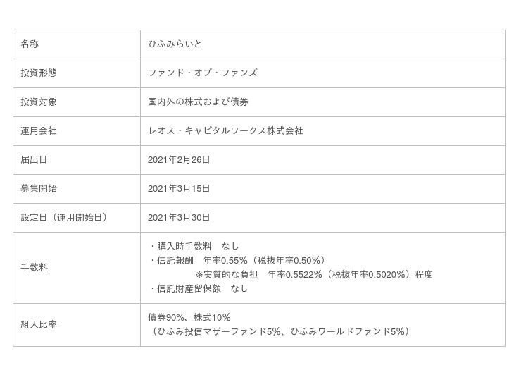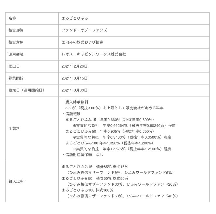 投資信託「ひふみ」シリーズを運用するレオス・キャピタルワークス株式会社(本社:東京都千代田区、代表取締役会長兼社長:藤野 英人、以下当社)は、国内外の株式および債券に投資対象としたアクティブ運用の公募投資信託「ひふみらいと」「まるごとひふみ」を新規設定いたします。本日2月26日、有価証券届出書を関東財務局長に提出いたしました。