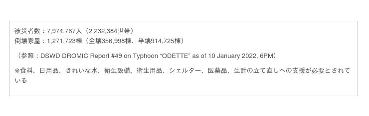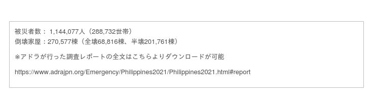 2021年12月16日から18日にかけてフィリピン中部地域を襲った台風22号(ライ/フィリピン名:オデット)の被害状況は、1月11日までに分かっているだけでも797万人(223万世帯)、倒壊家屋127万棟(全壊36万軒、半壊91万軒)にのぼっており、この数字は今後、交通網や通信網の回復が進むにつれてまだ増える可能性があります。