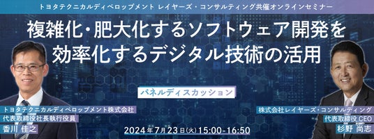 株式会社レイヤーズ・コンサルティング(東京都品川区、代表取締役CEO:杉野 尚志、以下:レイヤーズ)は、トヨタテクニカルディベロップメント株式会社(愛知県豊田市、代表取締役社長執行役員 香川 佳之)との共催にて、オンラインセミナー『複雑化・肥大化するソフトウェア開発を効率化するデジタル技術の活用』を2024年7月23日(火)に開催することを発表いたします。