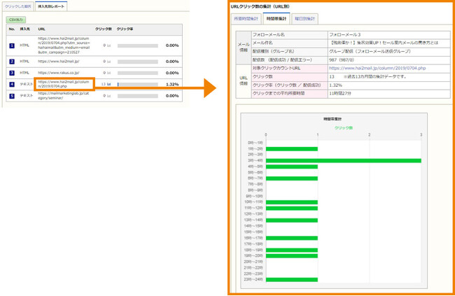 今回のバージョンアップにより、開封/クリックされるまでの所要時間や時間帯別の開封数、またURLリンクごとの時間帯別クリック数といった数値まで確認いただけるようになりました。
