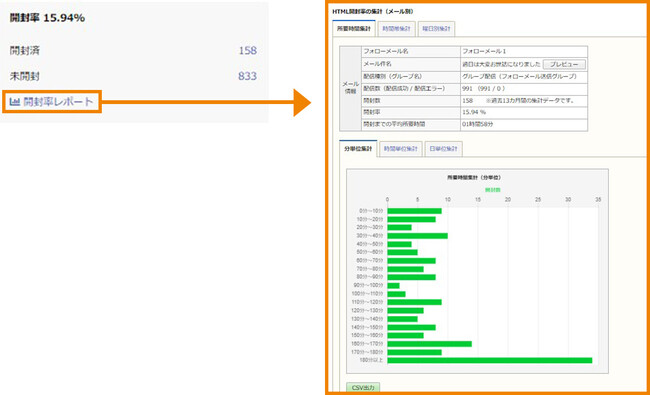 Ver.8.1でリリースした「フォローメール」機能に、開封率とクリック率の詳細を手間なく分析できるよう集計レポート機能を追加しました。