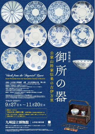 藤原北家の流れを汲む公家・山科家には、200点近くの禁裏御用の伊万里焼が伝来しました。同家には、食膳具である皿や杯のみならず、煙草盆や香炉など、江戸時代から明治時代の様々な種類の御所の器が下賜されました。本展では、山科家に伝来したこれらの貴重な禁裏御用品の全貌を初公開します。また、その生産地である佐賀・有田町に伝わる歴史資料や、宮中行事をあらわした絵図、さらに公家町遺跡から出土した禁裏御用品の陶片などを合せて紹介します。宮中を舞台に花開いた、清らかな伊万里焼の魅力をご堪能いただければ幸いです。