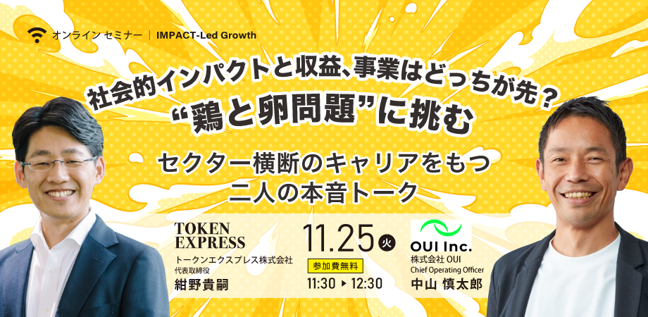 トークンエクスプレスと OUI Inc.がこれまで協業してきた中で、私たちはこの問いに挑んでいます。社会課題解決型ビジネスの「鶏(事業収益)が先か、卵(社会的インパクト)が先か」問題など、実践者が見て、感じてきた現場について本音で語るオンラインセミナーを開催します。