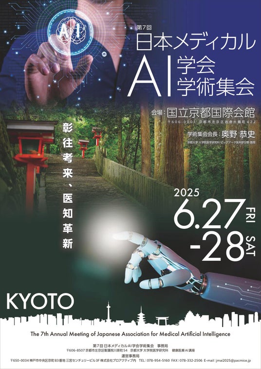 一般社団法人日本メディカルAI学会は、来る2025年6月27日(金)・28日(土)に国立京都国際会館(京都市)に於いて、第7回日本メディカルAI学会学術集会を開催いたします(大会長:奥野 恭史)。開催にあたり、第7回学術集会ホームページから参加登録を開始いたしました。