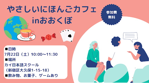 この度、特定非営利活動法人コンフロントワールドは、大久保(新宿区)における地域交流イベントとして、「やさしい日本語カフェ」を、2023年7月22日(土)10:00-11:30にカイ日本語スクールで初開催いたします。