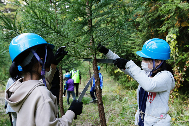 午後からは、森林に入り、林業についてのお話を聞き、ノコギリを使用した枝打ちや、ロープを引いて高さ約20mの木を倒す間伐体験を行いました。