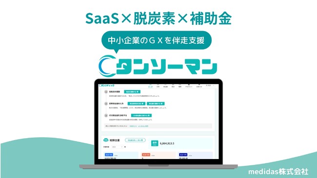 さらに、medidasが提供するCO2の排出量を見える化SaaSシステム「タンソチェック」を利用することで、CO2排出量の見える化~補助金の効果報告まで3~5年間のCO2管理を一気通貫で支援ができます。