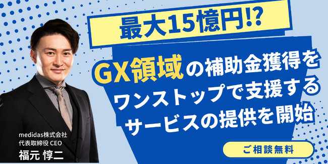 この度、medidas株式会社が企業のGX推進のため、GX領域関連をはじめとした補助金の相談、申請~補助金着金まで支援するサービスを開始いたしました。