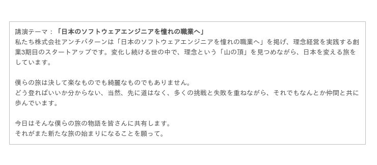 なお、本イベントのスポンサーセッションにて、弊社代表 小笹が「日本のソフトウェアエンジニアを憧れの職業へ」をテーマに講演をおこないます。