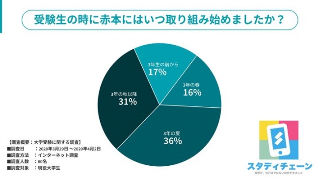 HUSTAR株式会社が運営する、1人ひとりに合わせた学習プランを指導するオンライン学習コーチングサービス『スタディチェーン』http://studychain.jp/ 編集部は、現役大学生に対して「赤本はいつから取り組むべきか」について調査しました。