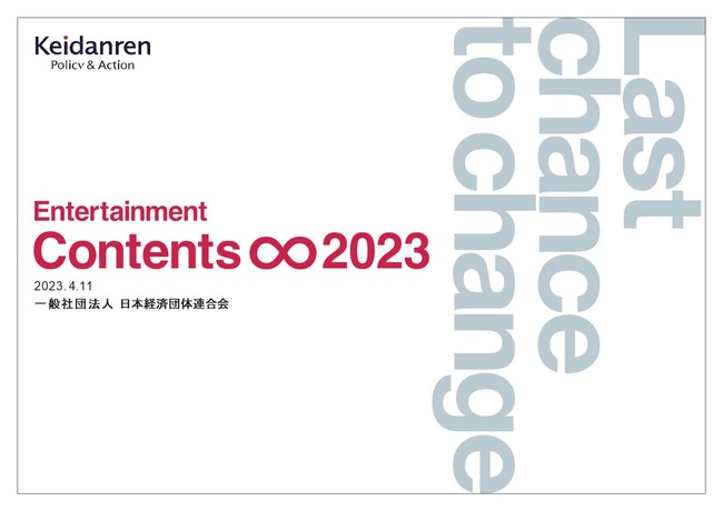 一般社団法人日本経済団体連合会(東京都千代田区、会長:十倉 雅和)は、2023年4月11日に提言「Entertainment Contents ∞ 2023 -Last chance to change-」を公表しました。