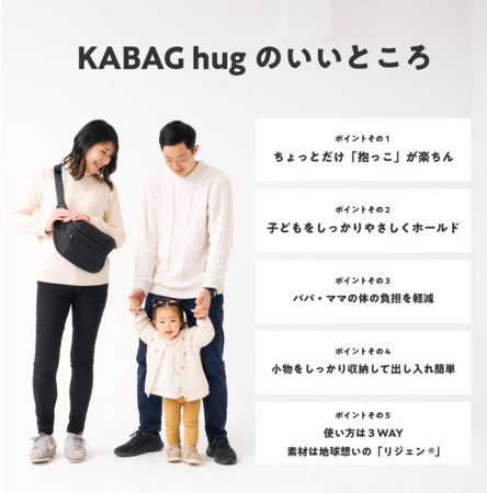 今回は、子育て中のパパ・ママの声をもとに、1歳から2歳のお子さんを連れた「こでかけ」を楽しくする『KABAG hug(ハグ)』を開発しました!