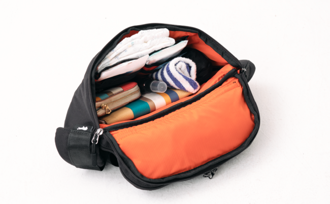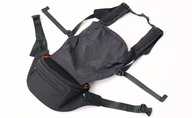 『KABAG hug』は、ウエストポーチのフタ部分に抱っこ紐を折りたたんで収納。抱っこ紐を使わない時はウエストポーチとして使用いただけます。
