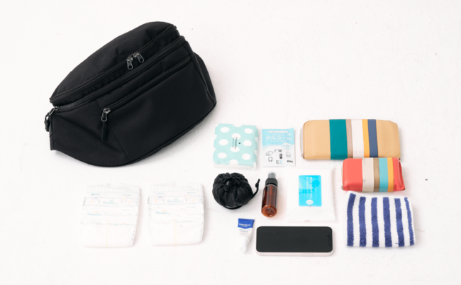 スマホ、鍵、タオル、ティッシュ、財布。最低限のお出かけグッズはしっかりと収納したい。さらに、抱っこしながら取り出しやすいポケットだったら◎。