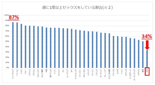 加えて、セックスの頻度についても同様の結果。世界の平均が72%(※2)に対し、日本人は34%(※2)。日本人の約三分の二は週に一度もセックスをしていないということになる。