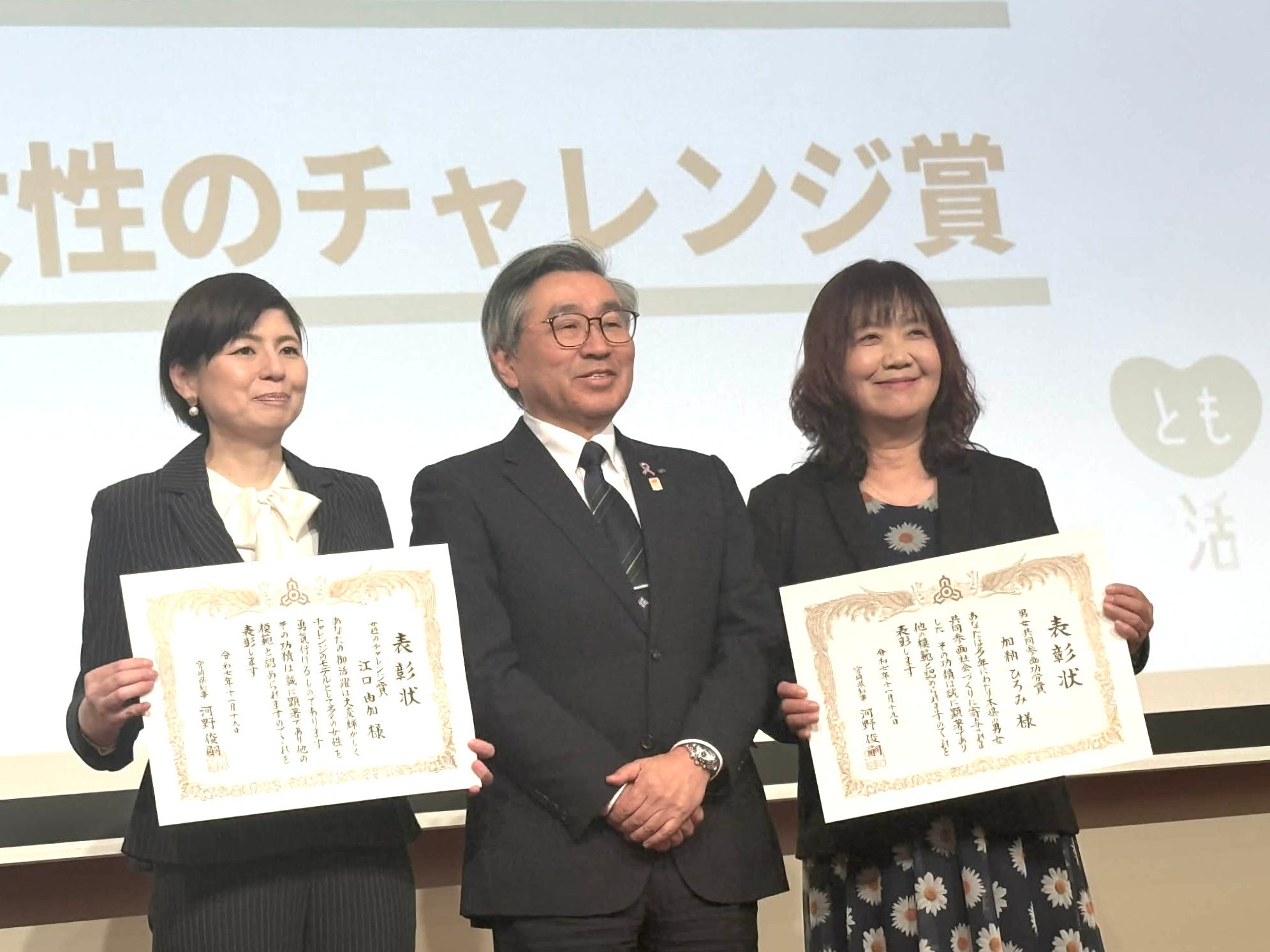「男女共同参画功労賞」は、宮崎県の男女共同参画施策において最も功労のあった人物に贈られるものです。加納は、令和7年11月19日(水)に宮崎市で開催された「ひなたの『とも活』推進大会」にパネリストとして参加した後、第2部の表彰式に出席いたしました。