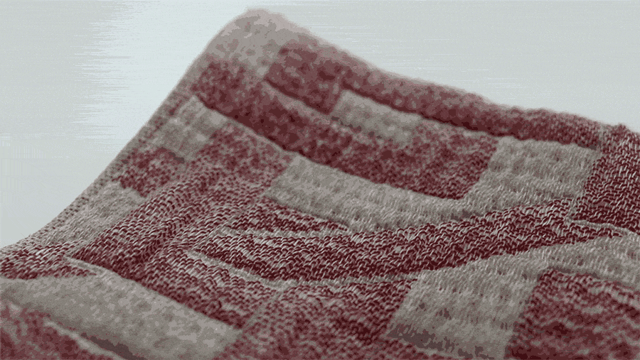 多層の中に柔らかいポリエステルのワタ糸と綿の中空糸という特殊な糸を織り込んでいるので、ふわふわ感が実現。肌なじみがどんどん良くなります。