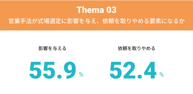 式場からの連絡手段や営業手法が式場選びに影響を与えると回答した方が半数を超えました。特に、それによって依頼を取りやめると回答した方も多数おり、他の式場と比較されやすい営業手法の部分にも気を配る必要がありそうです。