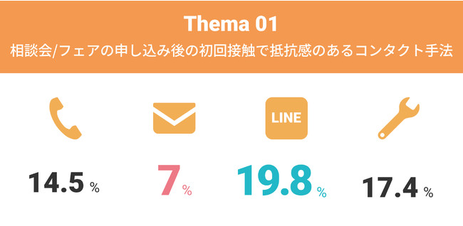 ・相談会/フェアお申し込み後、初めての営業担当からの連絡手段として抵抗感のあるツールは、LINEが最も高く、次いで独自ツール、電話、メールという順番。メールは抵抗感が最も低かった。