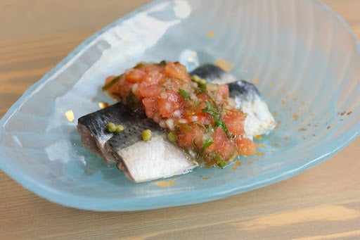 旬のマイワシを油で低温調理し、夏らしいさっぱりとしたトマトだれをあしらいました。日本人にとって身近な魚のひとつ「マイワシ」は、令和5年現在、海面漁業において最も漁獲の多い魚です。しかし、実際人間の口に入っているのは3割程度で、多くが水産養殖用のエサや、農畜産業向けの飼肥料として利用されています。イワシを食する重要性を知り、イワシの価値をあげたいという思いで提供しました。