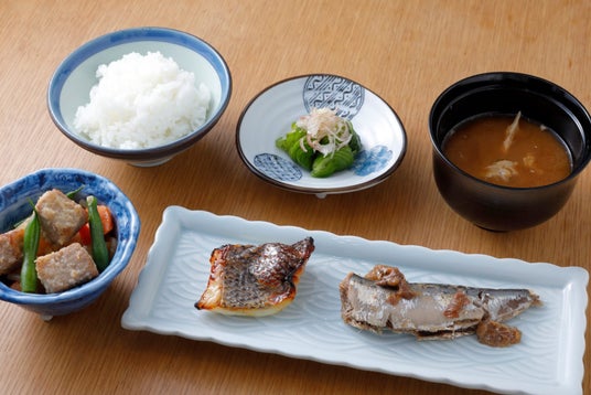 (血合いの煮つけ、山かけ、尾の身のつみれ汁、香の物、御飯)