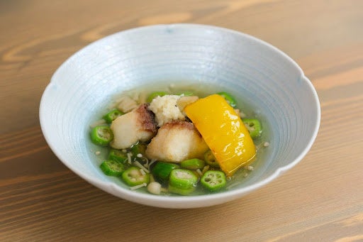 一品目に提供したのは、和食の根幹である「出汁」。出汁の基本となる真昆布は、10年前と比べ97%も漁獲量が減少、鰹節用のカツオも減少しています。和食における出汁の重要性、温かみを感じてもらい、出汁の美味しさを未来に残したいと、提供を決めた一品です。