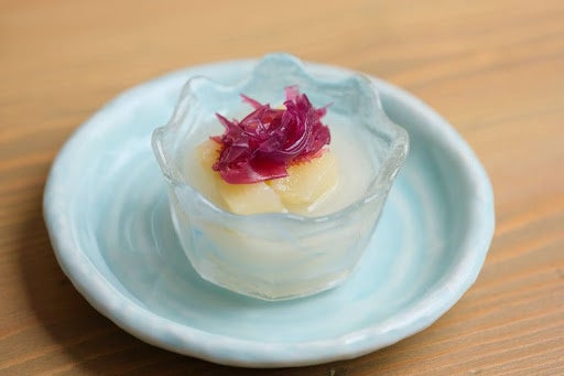 甘味には、旬の桃を白あんと合わせた水羊羹に、海藻の蜜漬けをあしらった一品。海のゆりかごとも呼ばれる海藻類は、魚の産卵や子育ての場として利用されることも多く、海の生態系の中で重要な役割をになっています。