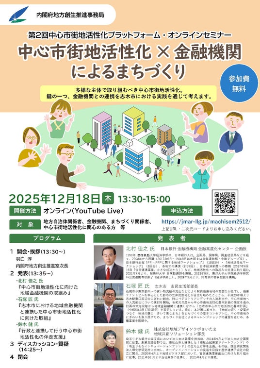 地方創生の重要課題である中心市街地活性化は持続可能な地域づくりの要です。多様な主体で取り組むべき中心市街地活性化について、金融機関との連携によるまちづくりをテーマに有識者や実践者が発表・議論します。