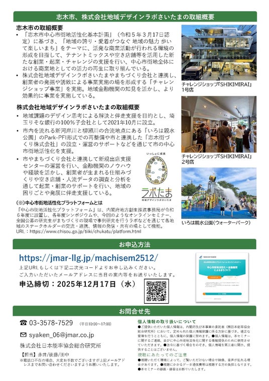 当日は、金融機関として日本銀行金融機構局金融高度化センター北村企画役より金融機関と行政が連携してまちづくりを行うことのポイント等について発表いただき、金融機関と連携し中心市街地活性化に取り組む事例として、埼玉県志木市市民生活部石塚部長、埼玉りそな銀行の100%子会社で、市と連携して中心市街地活性化をサポートする株式会社地域デザインラボさいたま地域共創ソリューション部鈴木部長より志木市(埼玉県)の中心市街地での取組等について発表の後、理論と実践の視点から、パネルディスカッションを行います。