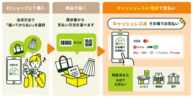 「届いてから払い」とは、ECサイトや通販などでのお買い物の際、「商品が届いてから、豊富な選択肢の中よりお支払い方法を決める」ことができる保証付き決済サービスです。従来どおり現金によるコンビニでのお支払いや銀行振込、郵便振替はもちろん、クレジットカード、スマホ決済、キャリア決済でのお支払いができるのが特徴です。