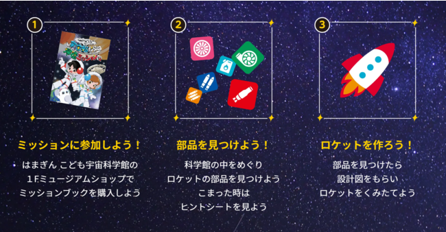今回のイベントの楽しみ方は3段階に分かれています。はじめは「見つける」楽しさ。館内の様々な場所に配置されたロケットの部品を探し出します。次に「つくる」楽しさ。ロケットの部品を見つけるとロケットの設計図が手に入るので、ロケットを組み立てます。そして最後は「分かる」楽しさ。組み立てたロケットを地球へと飛ばし、最後の答えを導きましょう。
