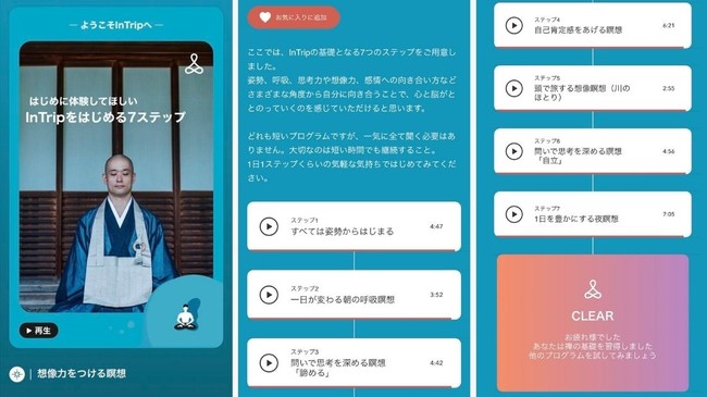 「InTripをはじめる7つのステップ」は、はじめてアプリを使う方にも分かりやすいよう、姿勢や呼吸の方法などから分かりやすく説明したプログラムです。