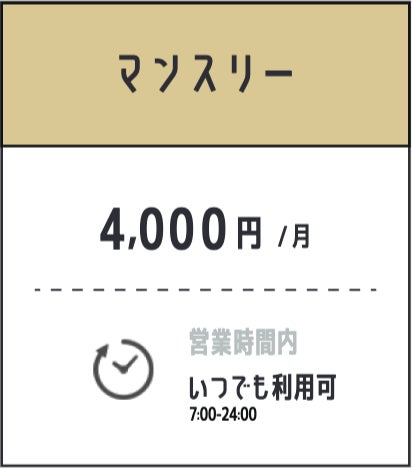 - 利用可能時間:7:00-24:00、いつでも出入り可能です。※毎週月曜日は10代限定開館日のため、10-19時はご利用いただけません。