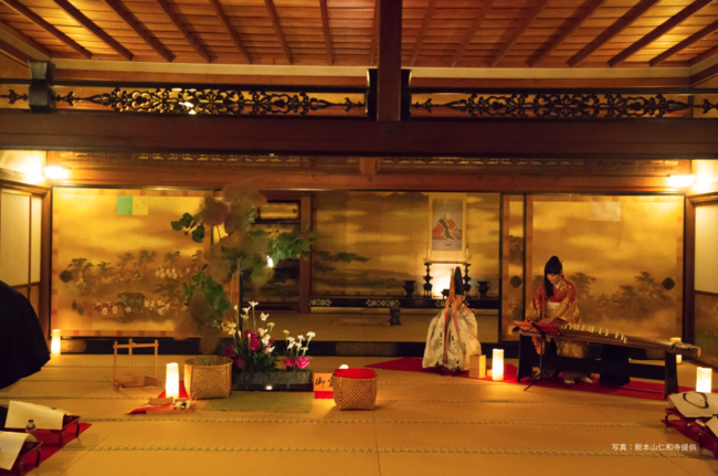 内容:世界遺産 仁和寺を貸切っての文化体験(特別法要・護摩祈願・ライトアップ拝観等)メゼババ高山大による特別ディナーコース、雅楽鑑賞 他