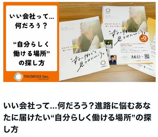 葬祭業にむけ人事コンサルティングや広報支援といったサービスを通して企業様が“いい会社”となるサポートを行っている、つむぎ株式会社(本社:東京都、代表取締役:前田亮)(以下・つむぎ)は就職活動を控える大学生に向け、やりがいのある働き方を伝えるため、【“働く”がちょっと楽しみになるZINE『“幸せに働く”を、見つけにいこう。』】を発行しました。