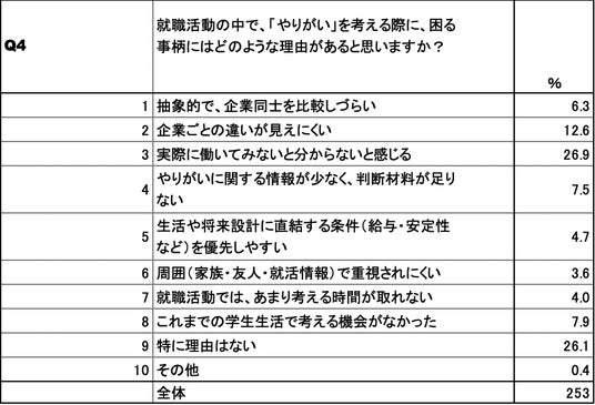 やりがいについて考える際の障壁となっている要素については「実際に働いてみないとわからない」という回答が最も多く、26.9%でした。学生の立場からするとやりがいを重視しようとしても、働いてみなければ判断のしようがないと考えられているようです。