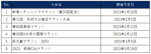事業開始に先駆け、2023年1月29日開催の新宿シティハーフマラソンをはじめとする全国6 マラソン大会(下記参照、2023年1月5日時点)に協賛し、「Fin Spo」に向けた活動を推進して参ります。