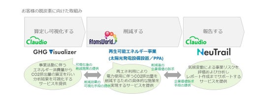 クラウディオが提要するデジタルサービスおよびESGコンサルティングサービスと、AtomsWorldが提供する再生可能エネルギー導入支援サービスを組合せた脱炭素経営コンサルティングサービスを提供致します。