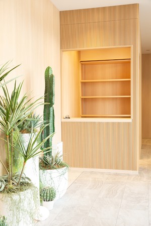 『ソライエ上尾原市』は商業施設だった建物を活かした作りになっていて、内観はコンパクトな広さながらもモダンスタイルで統一され、ご親族間のプライベートも尊重した作りになっています。天井はロゴで表している空へと続く道筋を描いたデザインになっています。その天井は、星が流れる祭壇と一体化しており、故人様を安らかにお見送りすることができる空間となっています。