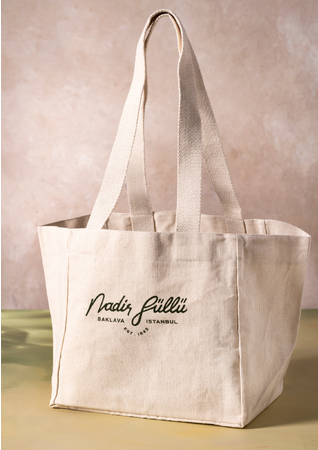 バクラヴァはもちろん、お惣菜やお弁当を入れても崩れにくく、A4サイズのアイテムも入る広めのマチと、肩からもかけられる長めのハンドルが使いやすいと評判のナーディル・ギュル オリジナルのトートバッグです。