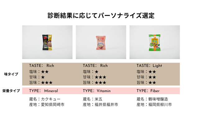 ※2023年9月25日時点_自社調べ、WEB診断による"味"と"栄養"に応じたフリーズドライ味噌汁のパーソナライズシステムで商品化されたものを指す